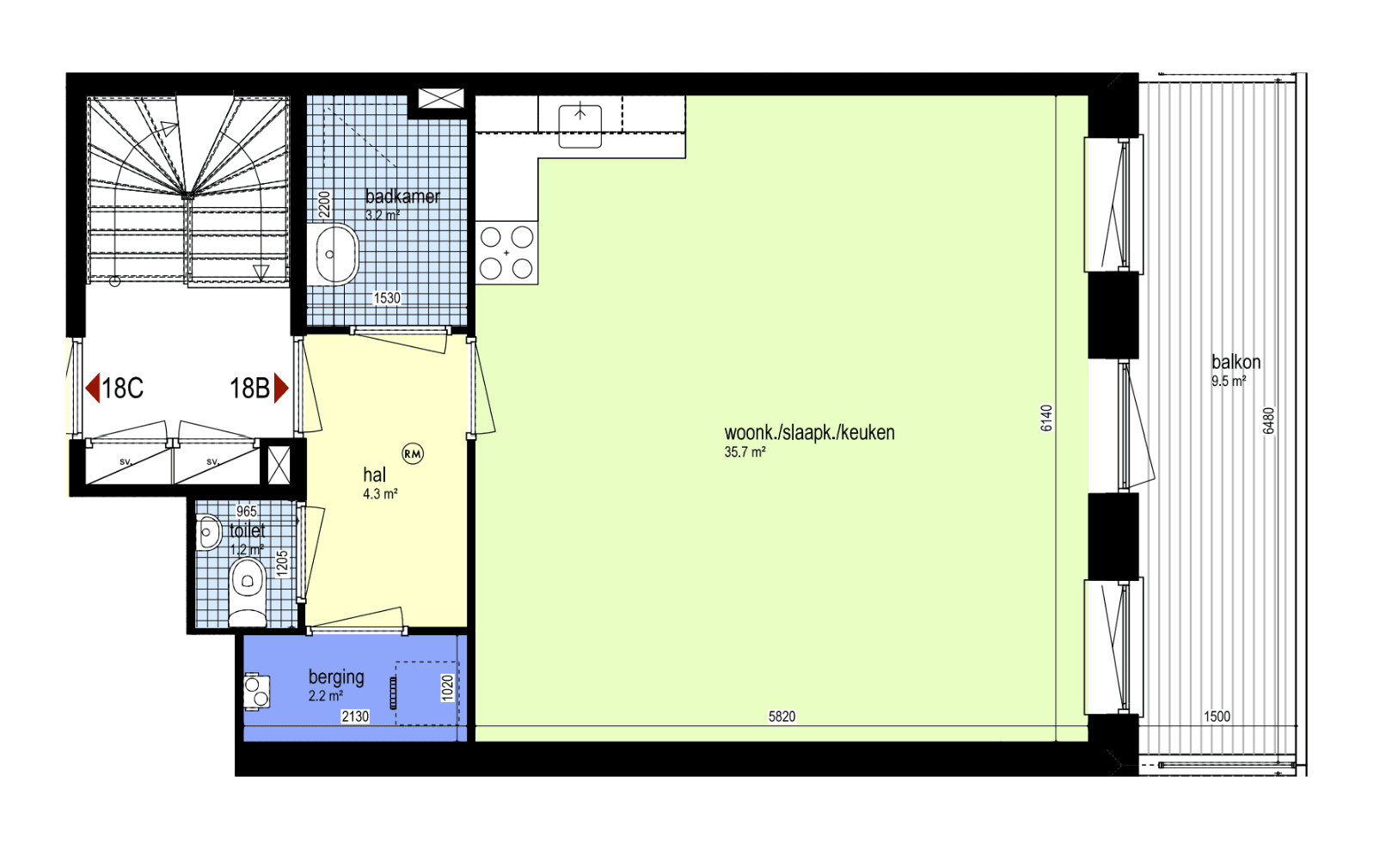 De woning, gelegen op de eerste verdieping, heeft een woon-slaapkamer met (open) keuken en grote ramen. Ook beschikt de woning over een balkon aan de achterzijde.