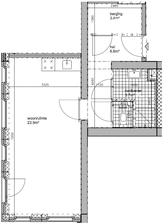 De studio is gelegen op de 11e etage van het woongebouw en beschikt over een eigen keuken en badkamer. Bekijk de plattegrond voor de indeling.