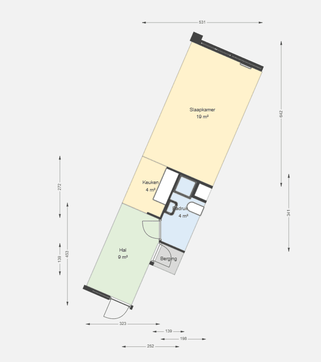 De woning heeft een open keuken en een badkamer met douche, toilet, wastafel en wasmachine aansluiting. Je hebt een kleine berging in je woning.