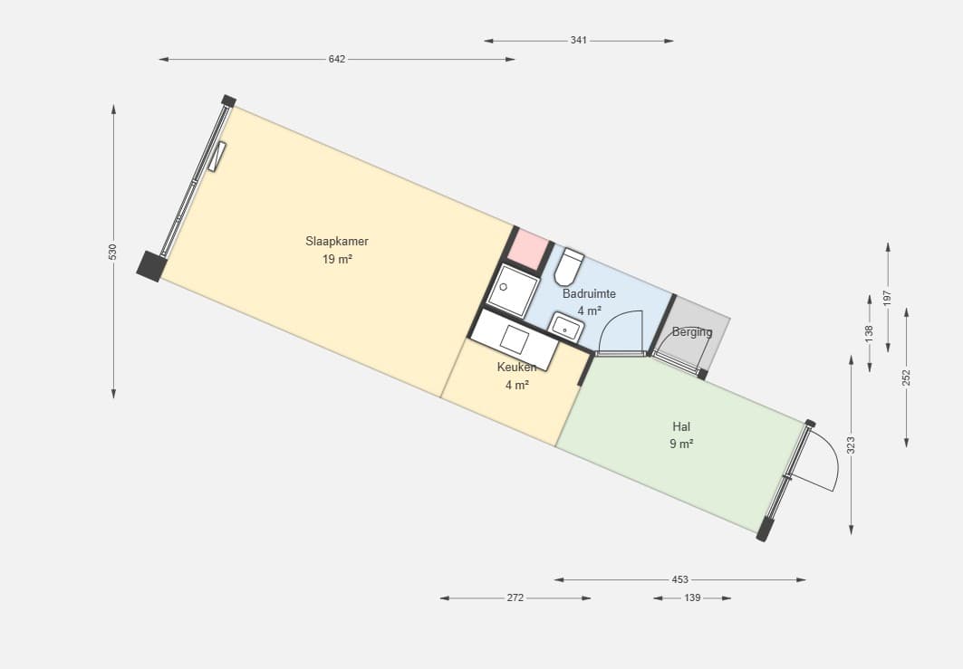 De woning heeft een open keuken en een badkamer met douche, toilet, wastafel en wasmachine aansluiting. Je hebt een kleine berging in je woning.