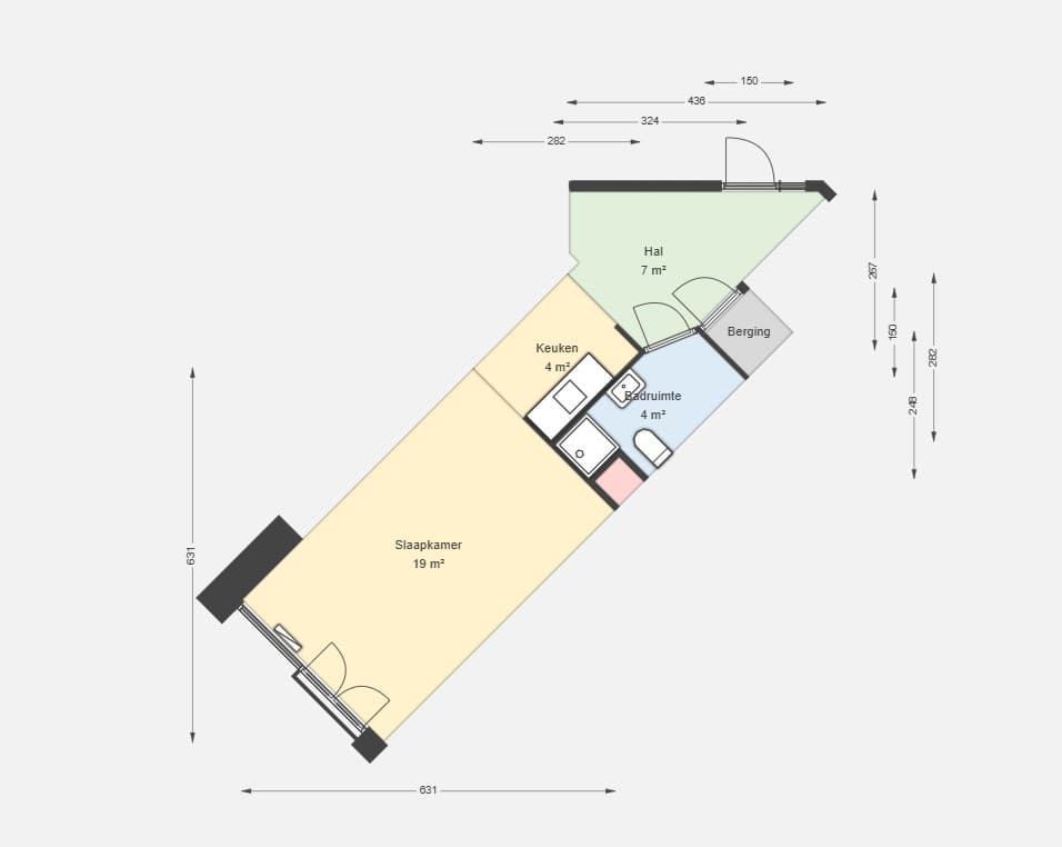 De woning heeft een open keuken en een badkamer met douche, toilet, wastafel en wasmachine aansluiting. Je hebt een kleine berging in je woning.