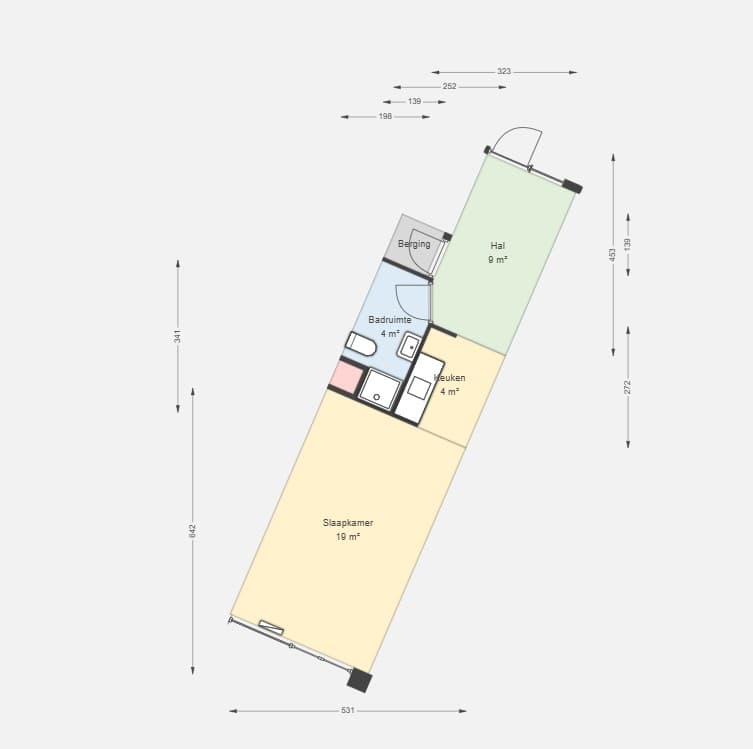 De woning heeft een open keuken en een badkamer met douche, toilet, wastafel en wasmachine aansluiting. Je hebt een kleine berging in je woning.